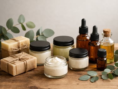 Cremas y jabones hechos en casa con ingredientes naturales.